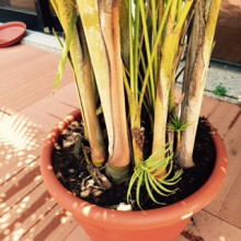 1月にゲットしたヤシが暑さでよれよれだったけれど,愛を沢山運んで,毎日ケアーしていたら復活。小さいベービーまで顔をのぞかしています。